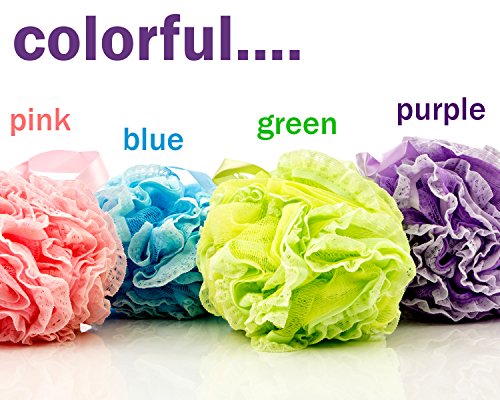 MONEY-SAVING BULK 4 PACK BATH SCRUBBIES - Get four bath poufs for one great low price! Blue, pink, purple and green poufs in one package!