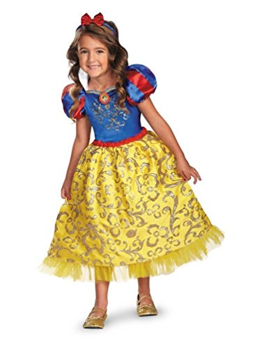 -. Binding : Apparel -. Brand : Disguise -. Color : Yellow -. Department : girls -. Feature : Includes dress with character cameo, petticoat and headband. / Shoes are not included. / This is an officially licensed Disney Princess (TM) Costume. / Available in kids sizes Toddler (3T-4T), Small (4-6) and Medium (7-8). / Includes a yellow and blue dress with character cameo, petticoat and matching headband. -. ProductGroup : Apparel -. ProductTypeName : DRESS -. Title : Snow White Sparkle Kids Costume deluxe
