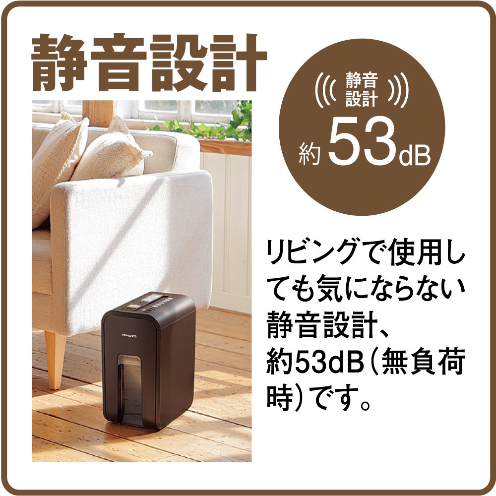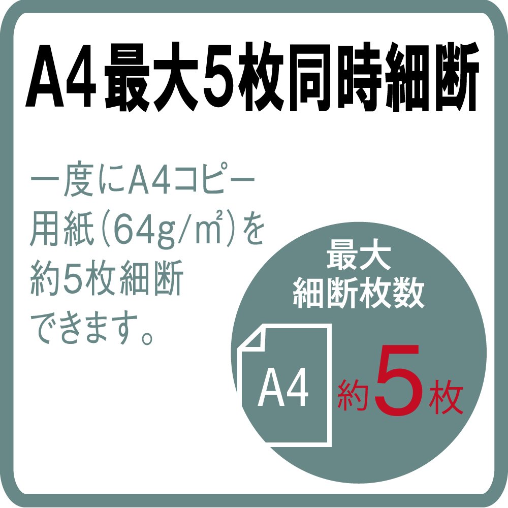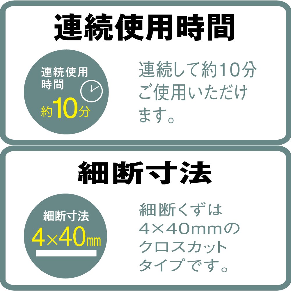 W17cm×D33cm×H30.6cm 【仕様】 メンテナンスシート1枚入り特典付き 【寸法】 170×330×306mm 【質量】 4.7kg 【最大裁断枚数】 (A4コピー用紙)約5枚 【細断寸法】 4×40mm 【細断速度】 約2.3m/分 【消費電力】 70W 【待機電力】 2.0W 【裁断方式】 クロスタイプ 【投入幅】 220mm 【ゴミ箱容量】 8L 【作動音】 約53dB 【連続使用時間】 約10分