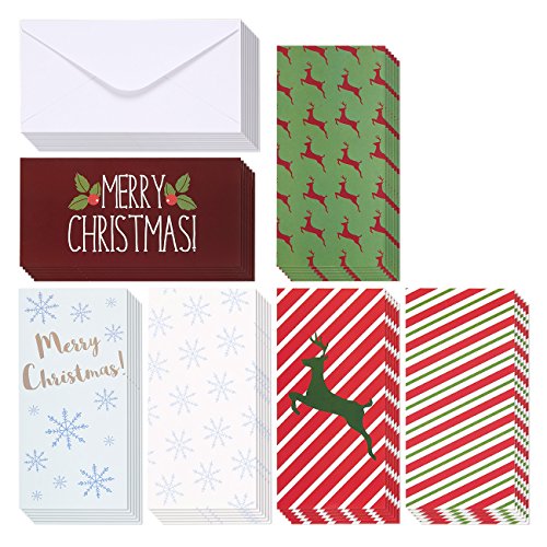 Studio : Juvale Publisher : Juvale Binding : Office Product Product Description Share the joys of the yuletide season with your friends, acquaintances, and loved ones. This assorted pack of 36 Christmas holiday money greeting cards will prepare you for all your card-sending needs! Cut the hassle of rushing to the store and overpaying for cards. This pack consists of 36 blank greeting cards to include your very own custom messages for corporate and personal use. Each card features one of 6 stunning holiday designs. Make a statement with these thank you cards made of high-quality, matte card stock that feels thick and sturdy. Each card measures at 3.5x7.25 inches and comes with corresponding envelopes. Ensure you have plenty of greeting cards on hand for when occasions arise. 0