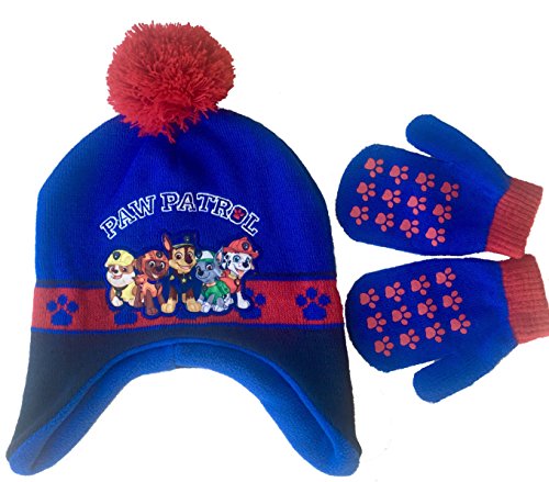 Product Description 2-Piece cold weather set includes beanie hat and mittens featuring Marshall, Chase, Rubble, Zumma Rocky from Nickelodeon's Paw Patrol Blue hat and mittens with red trimmings are made of durable acrylic knit. Hat has fleece lining. 0