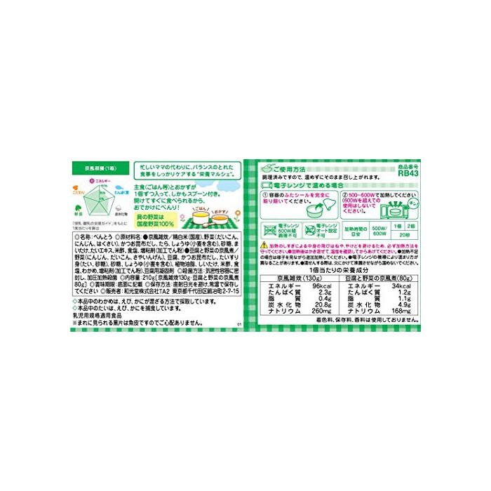 원재료:●쿄토풍 잡탕죽/정백미(국산)고, 야채(무우,(당근)인삼,서는 냄새가 나다)고, 가다랭이 다시마 이고,면,간장(밀을 포함한다)고, 설탕,춰 뛰어나고, 대 엑기스,미초,식염,증점제(가공 나오지 않겠 분) ●두부와 야채의 쿄토풍자/야채((당근)인삼,무우,꼬투리)고, 두부,가다랭이 다시마 이고,대 으깬 어육(대,설탕)고, 설탕,간장(밀을 포함한다)고, 식물성 기름지,하여 있어 뛰어나고, 미초,식염,미역,증점제(가공 나오지 않겠 분)고, 두부용 응고 제