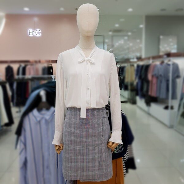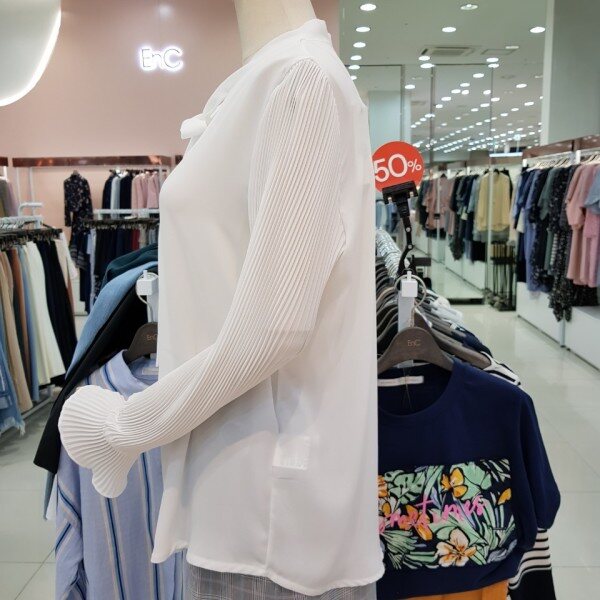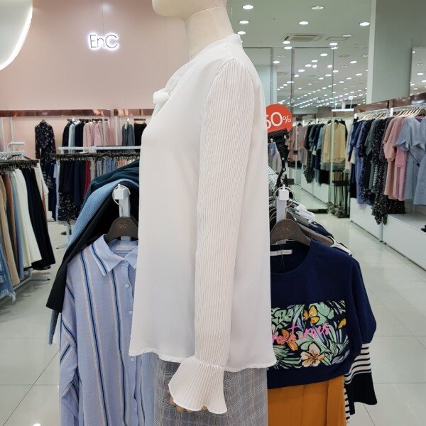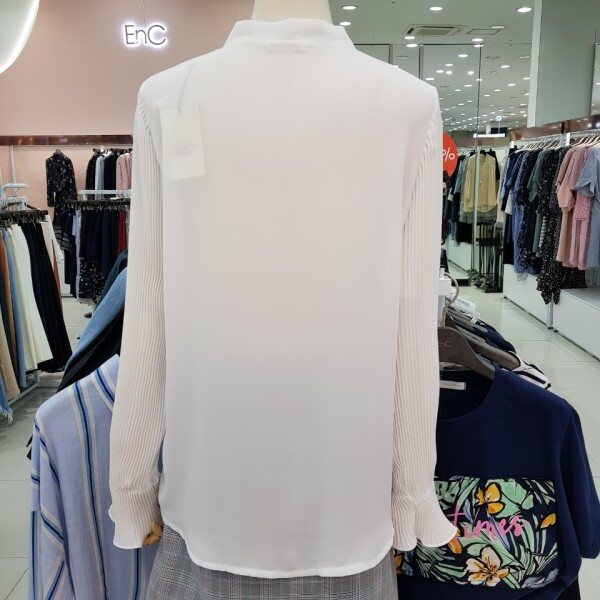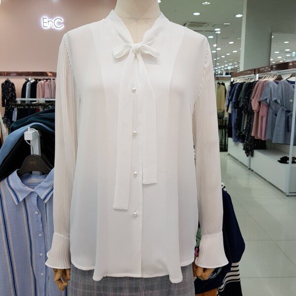 시원한 소재감으로 한여름까지 입으실수 있으며 여성스러운 플리츠 소매와 진주단추 목선의 리본이 포인트가되어밋밋할수 있는 색감에 디자인으로 우아한 분위기를 연출할수 있습니다