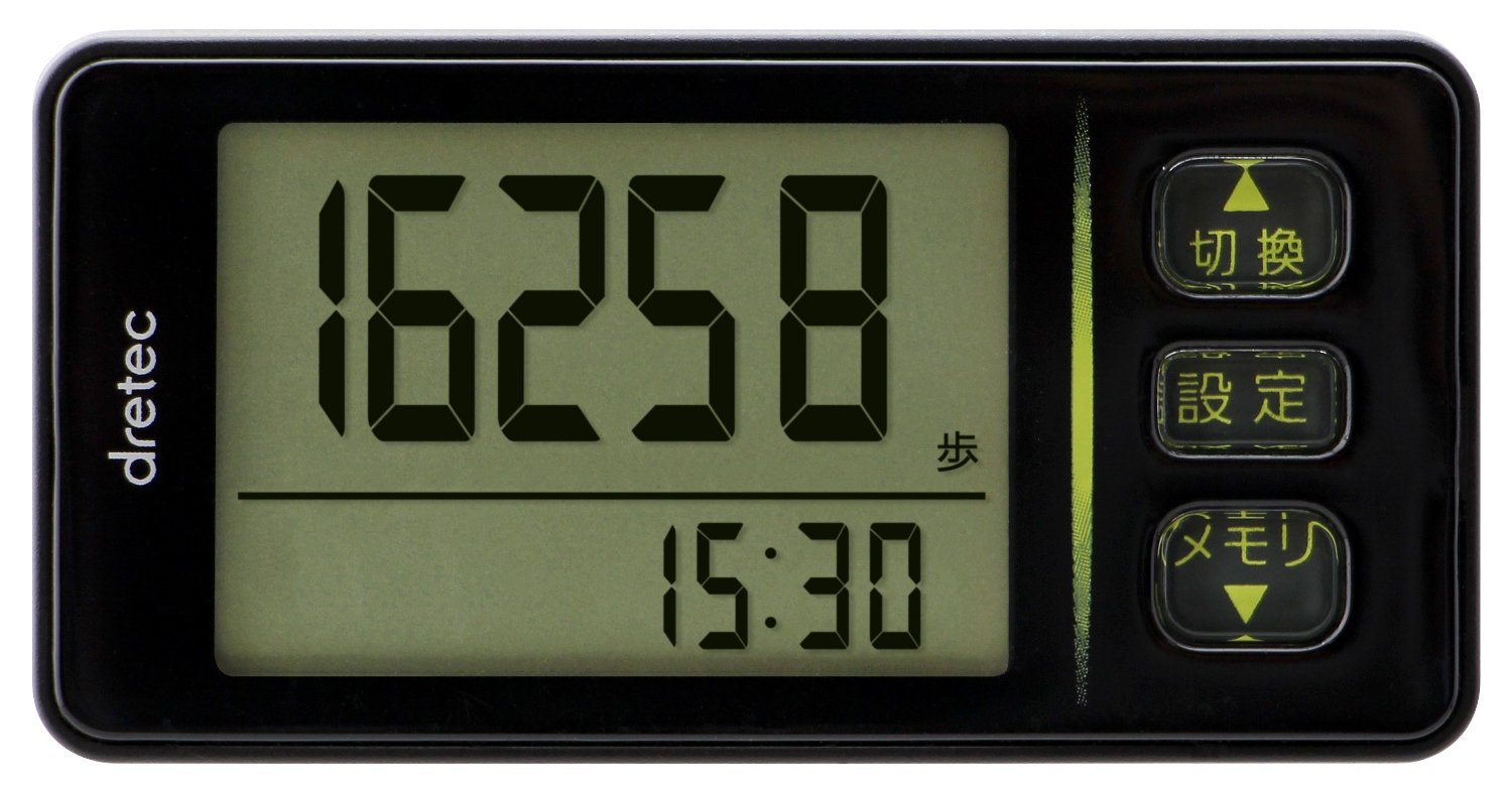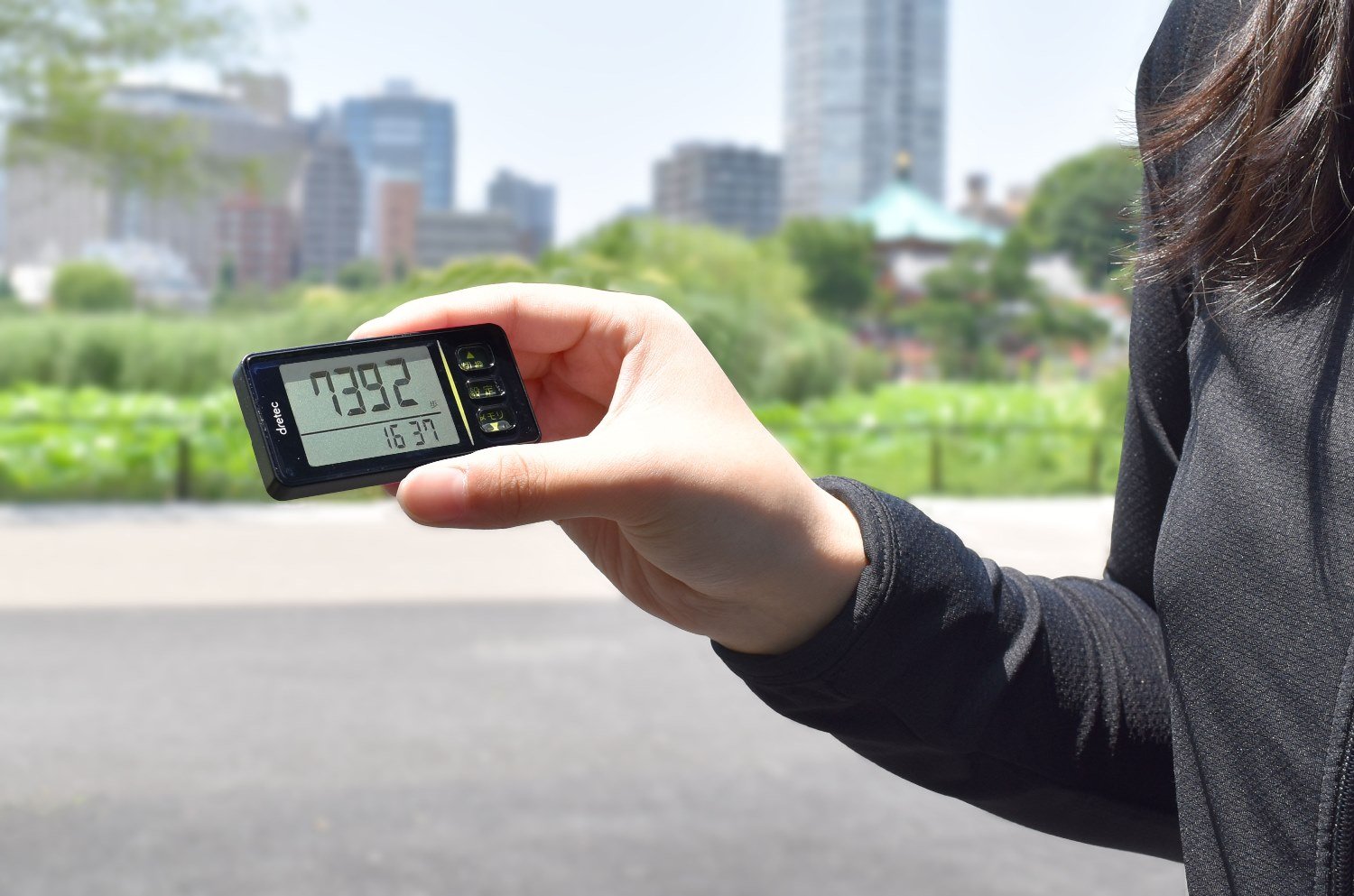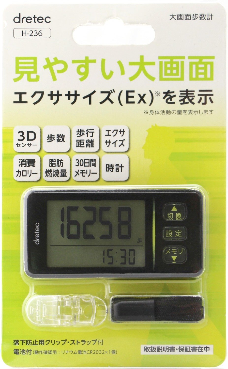 ● Displays the number of steps and calories burned on a large liquid crystal screen (40 × 27 mm).