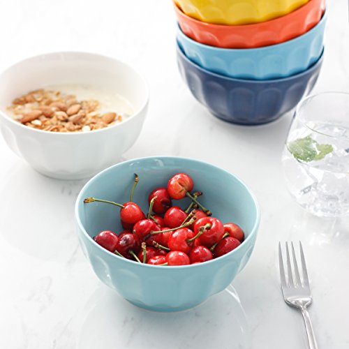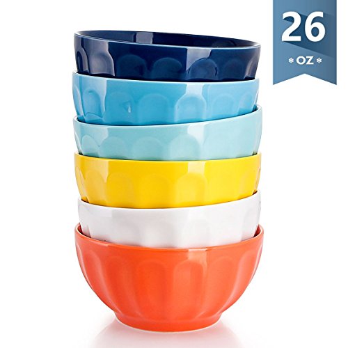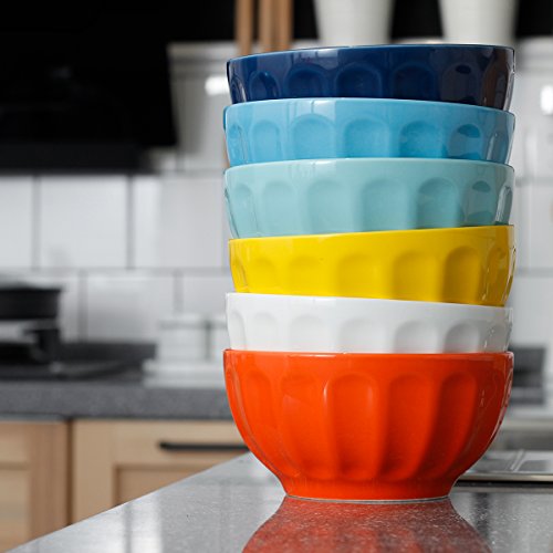 Sweese 1109 Porcelain Fluted Bowl Set - 26 OZ Deep and Microwavable for Cereal, Soup - Set of 6, Assorted Colors