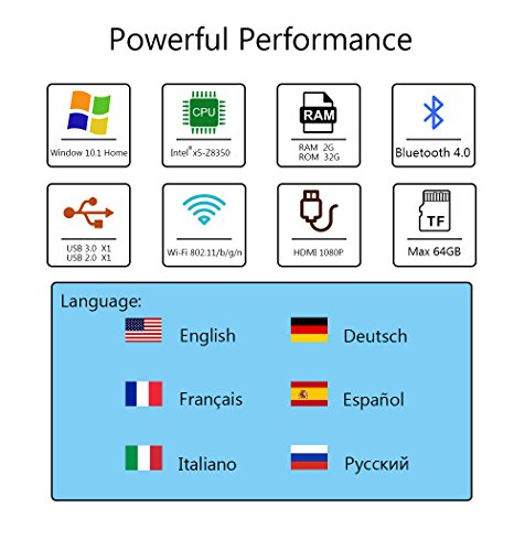 The Windows 10 system is based on Intel Atom x5 Z8350 processor, which is the newest, has 2MB of processor cache and a base speed of 1.44GHz; using Intel TurboBoost, it can go as fast as 1.92GHz.