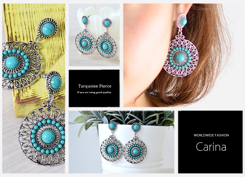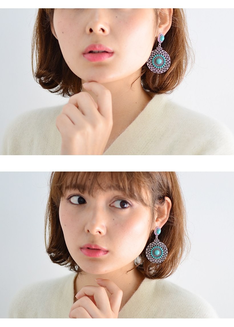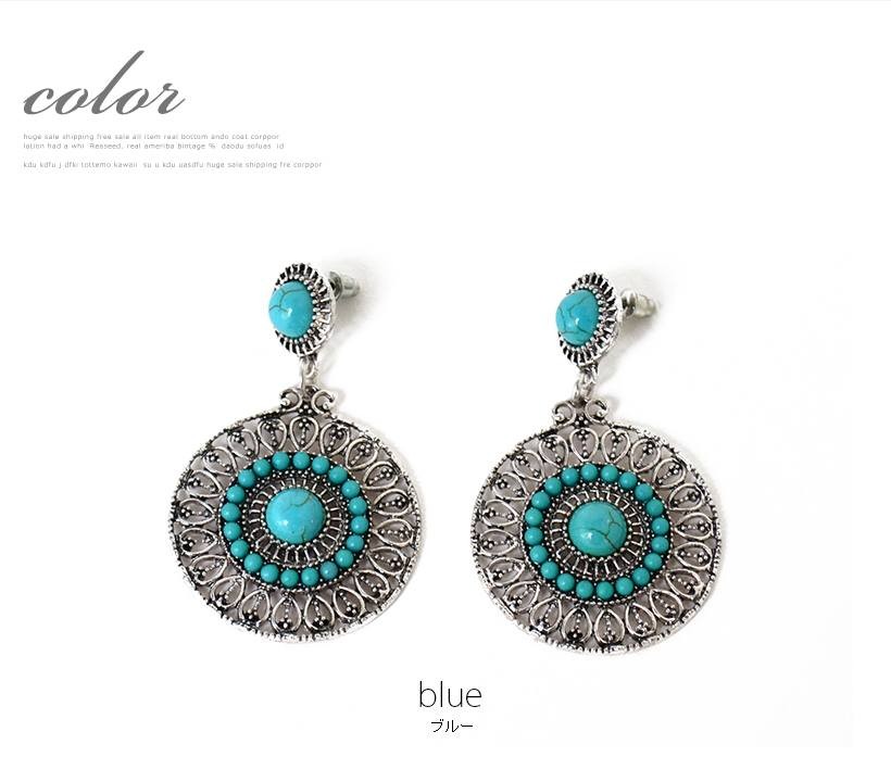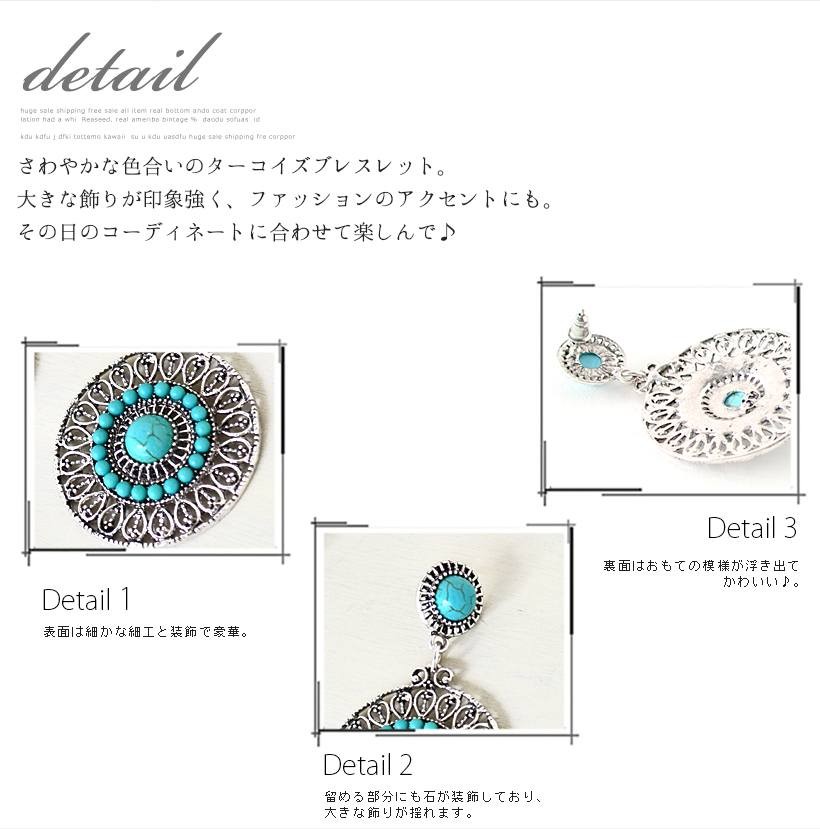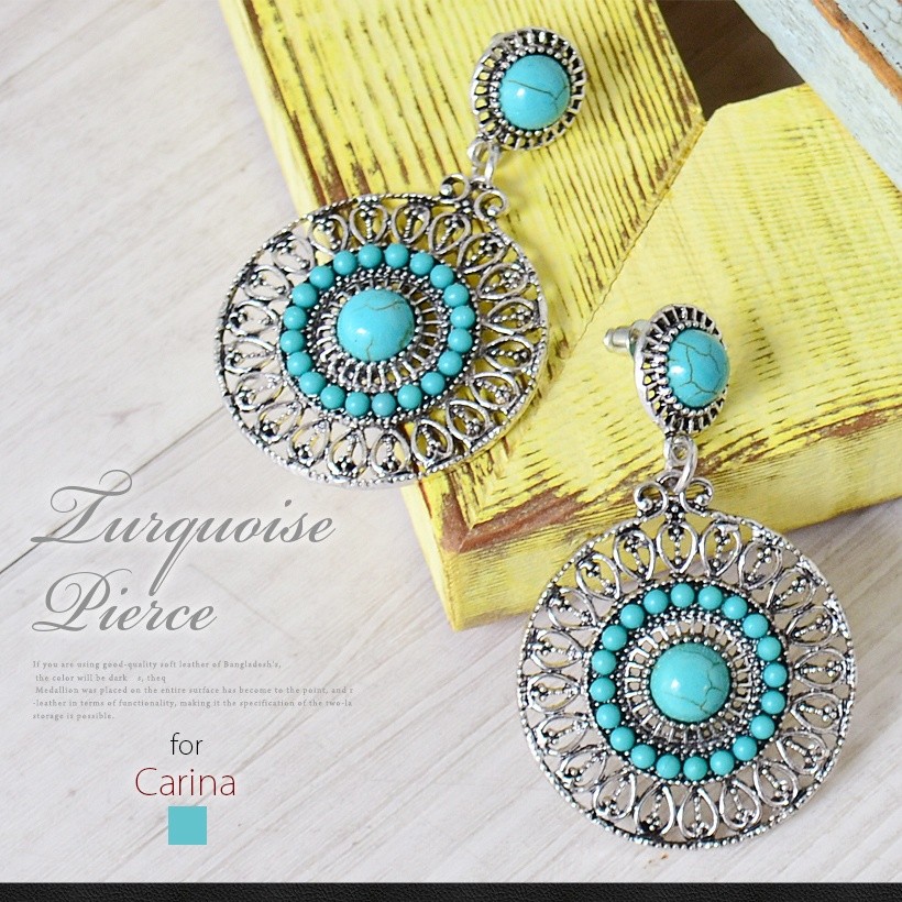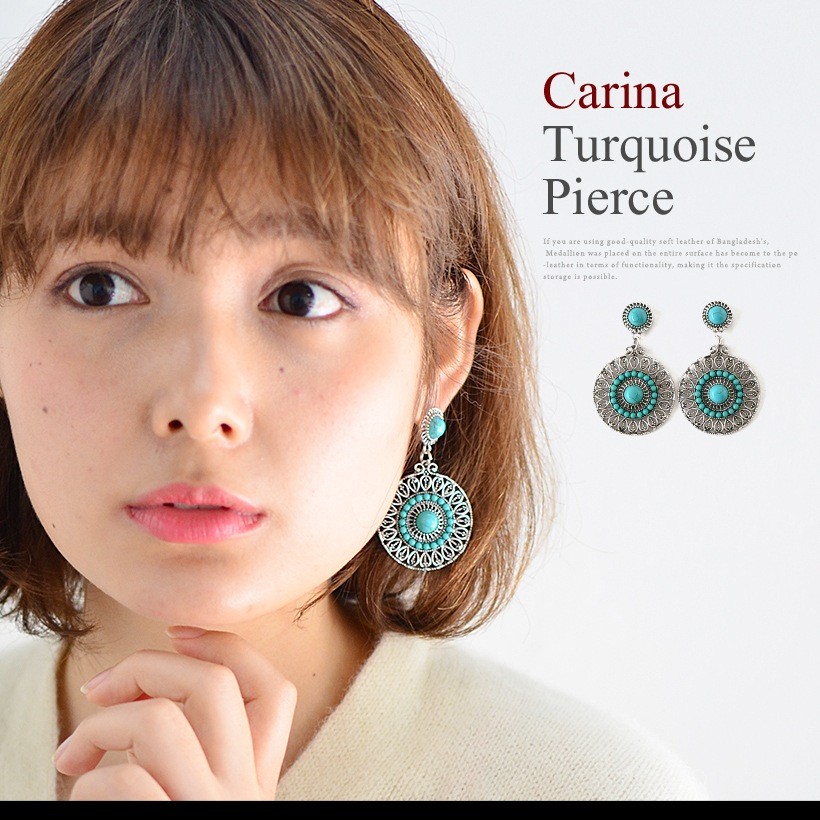 夏コーデを盛り上げてくれる爽やかなターコイズピアス。インパクトのある大きいサイズ感で、エスニックの雰囲気を持ち合わせたデザイン。歩くたびにゆらゆらと揺れて、顔回りが華やかに映えるターコイズアクセサリーはワンポイントに。●縦:約5.5cm 縦:約3.5cm●重さ:約9g(片方)●素材:練りターコイズ●仕様:フックピアス[カラー]ターコイズブルー