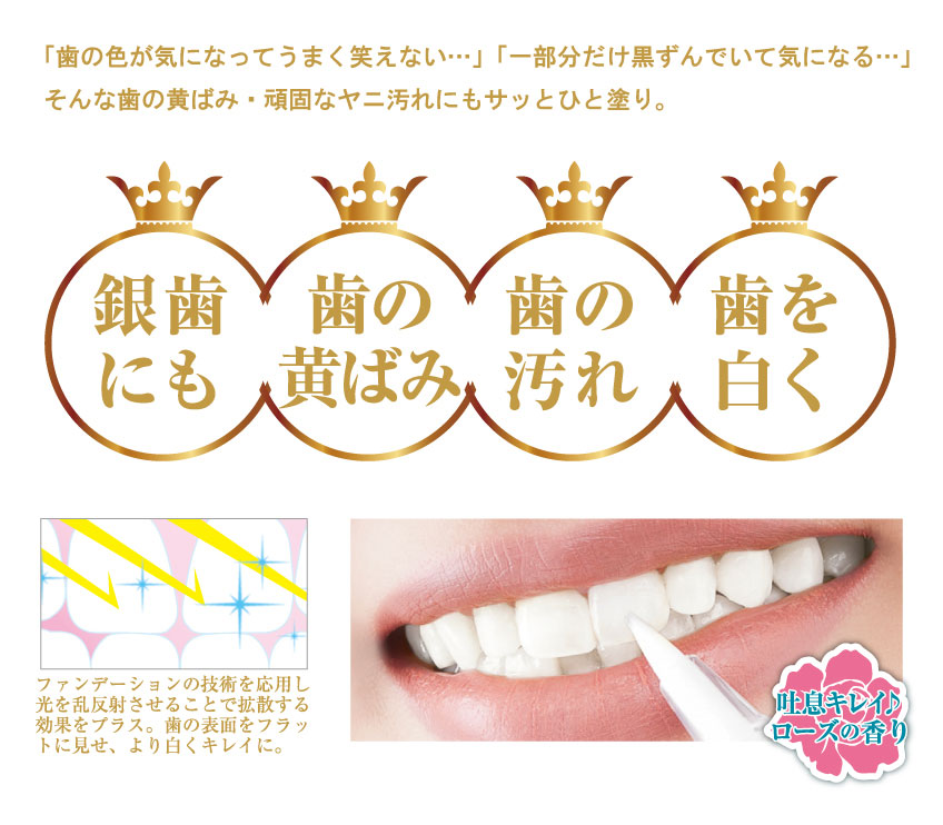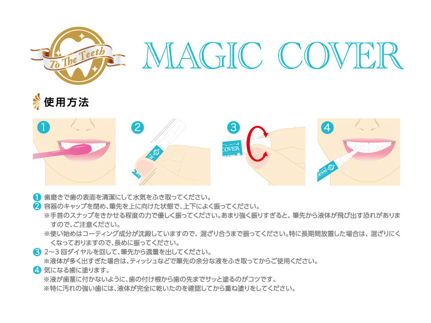 | 使用方法 | 歯磨きで歯の表面を清潔にして水気をふき取ってください。 容器のキャップを閉め、筆先を上に向けた状態で、上下によく振ってください。 手首のスナップをきかせる程度の力でやさしく振ってください。あまり強く振りすぎると、筆先から液体が飛び出す恐れがありますので、ご注意ください。 使い始めはコーティング成分が沈殿していますので、混ざり合うまで振ってください。特に長期間放置した場合は、混ざりにくくなっておりますので、長めに振ってください。 2~3回ダイヤルを回して、筆先から適量を出してください。 液体が多く出すぎた場合は、ティッシュなどで筆先の余分な液をふき取ってからご使用ください。 気になる歯に塗ります。 液が歯茎に付かないように、歯の付け根から歯の先までサッと塗るのがコツです。 特に汚れの強い歯には、液体が完全に乾いたのを確認してから重ね塗りをしてください。 |