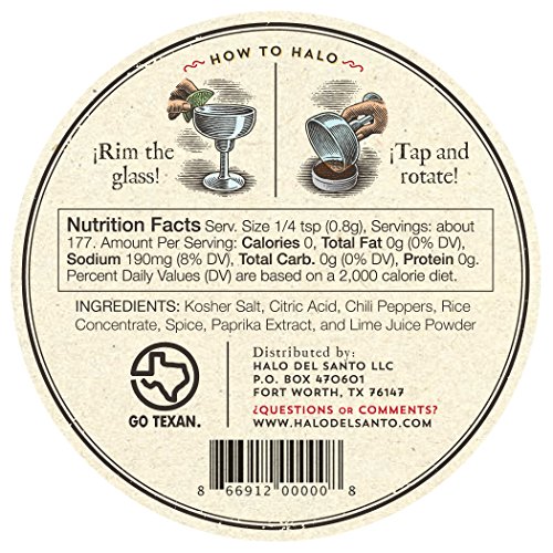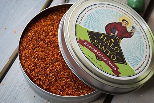 -. Feature : Each 5-oz. tin of spicy, salty, sour Halo del Santo rims 177 glasses / Our celebrated, all-natural blend of Kosher Salt, Fiery Chile, Tart Citrus / For margaritas, micheladas, palomas, Bloody Marys, and Mexican beers / As seen in the Los Angeles Times, Chicago Tribune, and others / Made with care in Texas for lovers of authentic Mexican food and drink