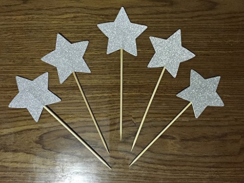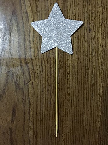 Toomeecrafts Double Sided Silver Star Cake Topper Silver Glitter Star Wand Cake Topper Cupcake Topper Wedding Cupcake Toppers Set of 12