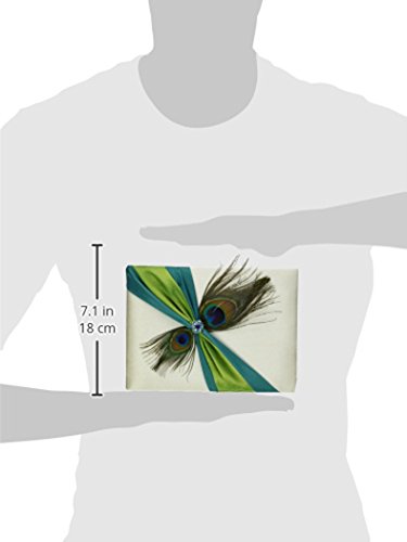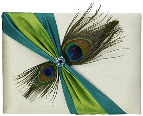 - Feature : Peacock feathers bring in the colors and textures of nature / The front cover is accented by a teal and green sash, 2 peacock feathers and a rhinestone ornament / Measures 8.5" / Book has 55 two-sided pages for a total of 990 signatures / Fashionable and trendy wedding accessory