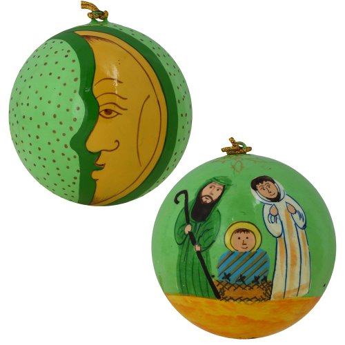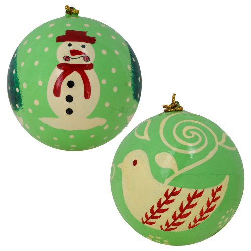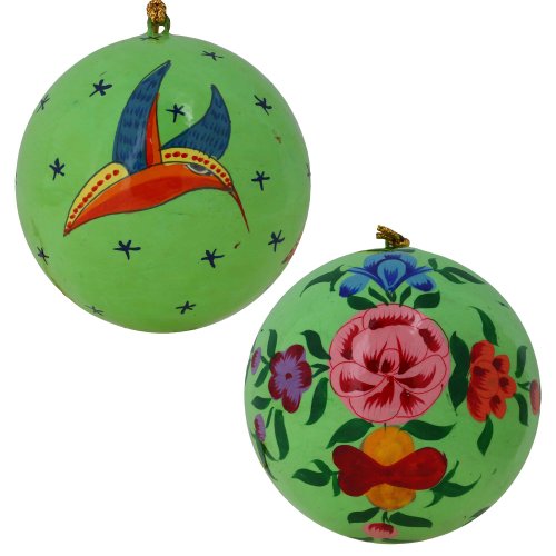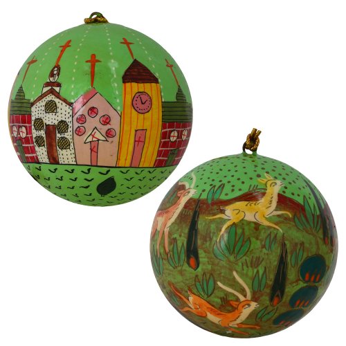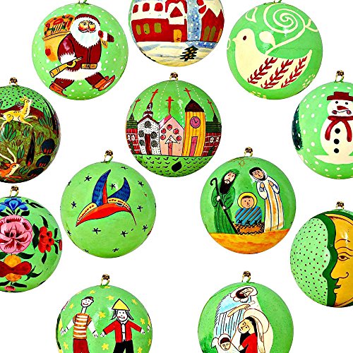 - Feature : - Handcrafted in Kashmir, India with a traditional local paper mache technique / - Set of 12 matching hanging balls with a bright green base / - Each ball is hand painted with a different scene / - Balls measure 3 inches in diameter and have loops at the top for hanging / - Perfect gift for the holiday season