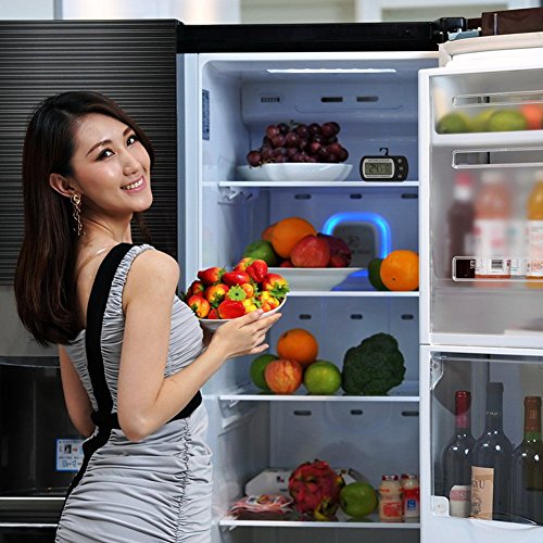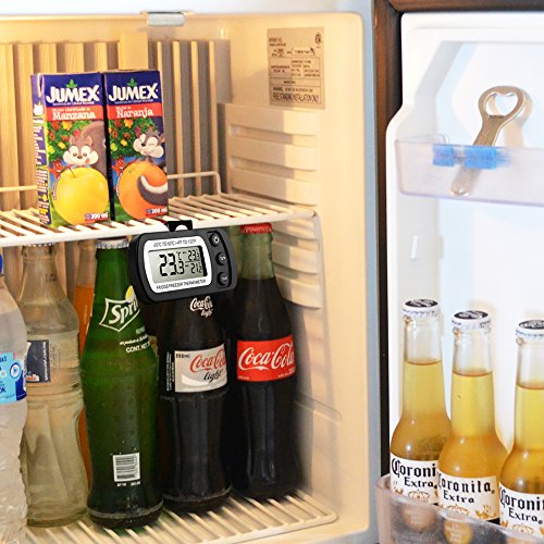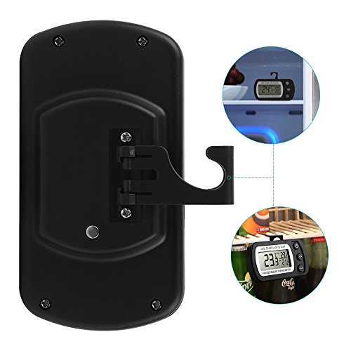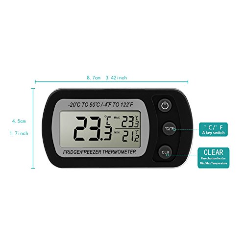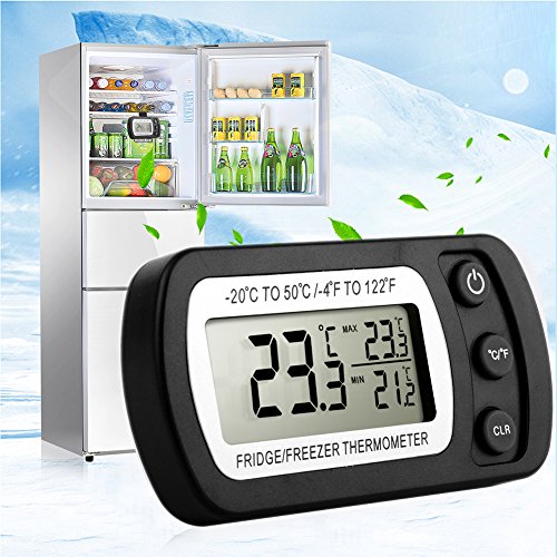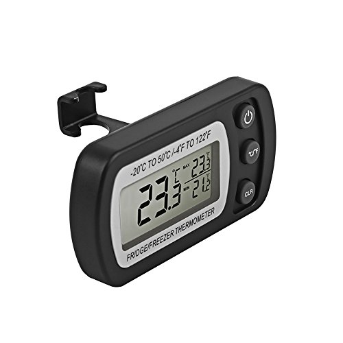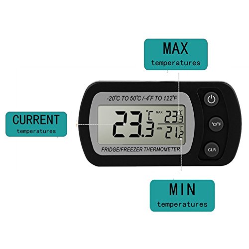 Studio : Glamouric Publisher : Glamouric Product Description 2 pcs Refrigerator Thermometer - Glamouric Freezer Room Thermometer with Hook LCD Display Waterproof Max/Min Record Function for Home Kitchen Restaurants Bars Cafes (Black) Features: Wide Range on temperature indication Accurate temperature readings for food preservation Max, min and current temperatures at the same time Large LCD display with only 3 buttons, easy to operate Compact size with a foldable hook Specifications: Measuring Temperature Range: -20°C to 50°C / -4°F to 122°F Accuracy: ±1°C/±2°F Waterproof Level: IPX3 Operating Voltage: 3V, CR2032 battery,1 pc Package Dimensions: 13.8 x 9 x 2.8 cm/5.4 x 3.5 x 1 inch Shipping Weight: 110 g How to change battery? Please replace the battery when readings become erratic or the display clarity fades. Loosen the screws on the back and open the ABS shell, and change it with a new one. (Battery: 3V Model CR2032 Lithium Battery) Important Notes: 1. Do not soak it in water. 2. When the display is dim, please change the battery as the instruction says and tighten the screws. 3. It needs about a minute for reaction about the temperature. 4. It works better in a freezer or refrigerator. 5. Press CLR button,the max/min temperature readings will be reset. 6. Please clear/reboot if you think the readings are inaccurate. Package Includes: 2 x Glamouric Refrigerator Thermometers in Black (Build-in battery) 2 x User Manuals 0