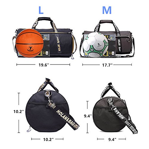 -. Feature : Single shoes compartment, big bag that enough for football and basketball; carry everything what you need, such as water bottle, sport coat, cap, sunglasses) / If you put shoes in, they will take a part of space of big main bag, but still enough for put one basketball or football / You can carry it for any sports (basketball, football, yoga, tennis, badminton, baseball, swimming, hiking and more; exercise and training), and short-term travel, outdoor photography and picnic / Material: Polyester + PU + Zipper; waterproof, durable and high quality / M - 17.7" x 9.4" x 9.4" (25 L), enough for #5 football; L - 19.6" x 10.2" x 10.2" (34 L), enough for basketball