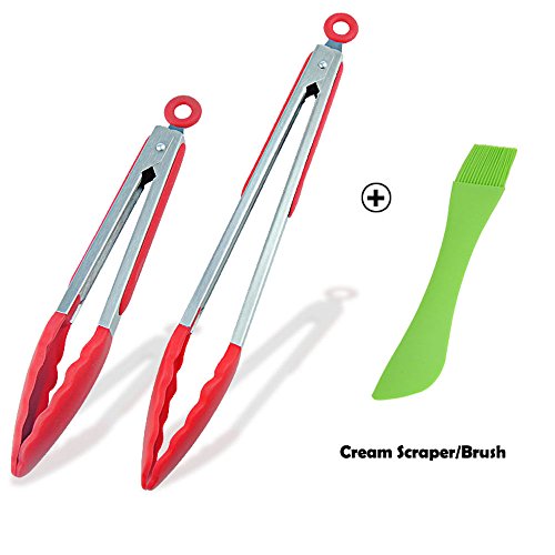 Premium Silicone Kitchen Tongs Set (9" & 12"),LYASI Kitchen Cooking Silicone Barbecue Clip for BBQ, Salads,Grilling,Serving and Fish Turning with a Multipurpose Cream Scraper/Brush