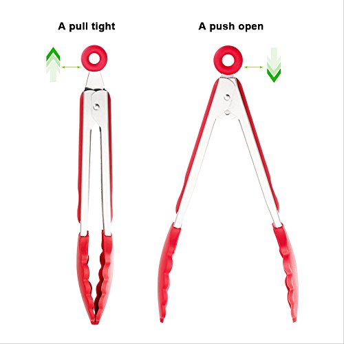 - AMAZING GRIP & WITH LOCKING DESIGNING,scalloped steel heads offer amazing grip and control,LYASI 9" & 12" silicone kitchen tongs equipped with a new Pull-Ring and soft silicone heads to keep the kitchen tongs closed at any time and they can be easily stored with your other kitchen utensils.