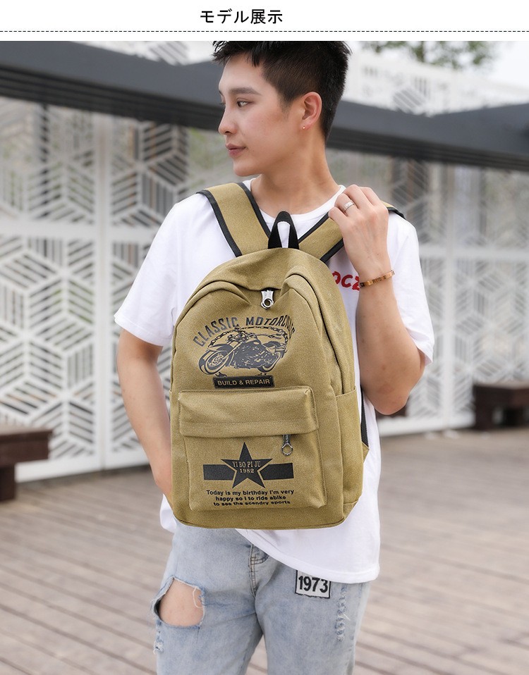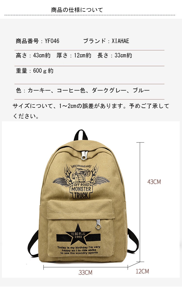 材質:表面:キャンパス 裏面:ポリエステル色:写真通り重量:サイズ:長さ:33cm約高さ:43cm約 厚さ:12cm約重量:600g約商品内容:1xバックバッグ 特徴:【高品質】高品質なキャンパスとポリエステルで作って、バッグの品質が保証です。【大容量】大容量のバックバッグですが、ノードパソコン、ipad、本などがすべて収納できます。【簡単なデザイン】簡単なデザインなので、通勤はもちろん通学?ビジネスなど幅広いシーンで活躍!アウトドア活動なども利用できます。