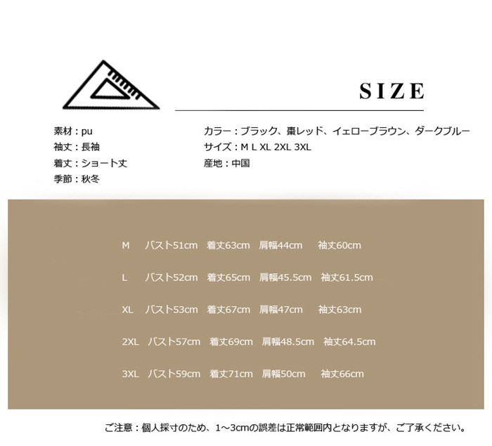 ライダースジャケット メンズ レザージャケット ショート丈 フェイクレザージャケット 無地 pu革 秋冬アウター ブラック 黒 大きめ 革ジャン 新作 レザージャケット メンズ ショート丈 大きめ 秋冬アウター商品詳細素材:pu袖丈:長袖着丈:ショート丈季節:秋冬カラー:ブラック、棗レッド、イェローブラウン、ダークブルーサイズ:M L XL 2XL 3XL産地:中国サイズ参照表M バスト51cm 着丈63cm 肩幅44cm 袖丈60cmL バスト52cm 着丈65cm 肩幅45.5cm 袖丈61.5cmXL バスト53cm 着丈67cm 肩幅47cm 袖丈63cm 2XL バスト57cm 着丈69cm 肩幅48.5cm 袖丈64.5cm3XL バスト59cm 着丈71cm 肩幅50cm 袖丈66cmご注意:個人採寸のため、1~3cmの誤差は正常範囲内となりますが、ご了承ください。ライダースジャケット メンズ レザージャケット ショート丈 フェイクレザージャケット 無地 pu革 秋冬アウター ブラック 黒 大きめ 革ジャン 新作 レザージャケット メンズ ショート丈 大きめ 秋冬アウター
