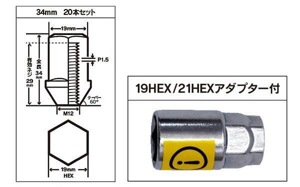 | セット内容 | ジュラルミンナット M12×P1.5 34mm×20本 19HEX/21HEXアダプター |