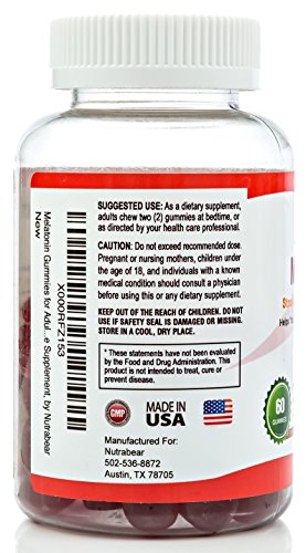 -. Binding : Health and Beauty -. Brand : Nutrabear -. EAN : 0743724117431 -. Feature : Helps you fall asleep faster / Tastes delicious and mildly sweet (much better than sleeping pills) / Perfect for both kids and adults / Take just 1-2 gummies for full effect -. Label : Nutrabear -. Manufacturer : Nutrabear -. PackageQuantity : 1 -. ProductGroup : Health and Beauty -. ProductTypeName : HEALTH_PERSONAL_CARE -. Publisher : Nutrabear -. Studio : Nutrabear -. Title : Melatonin Gummies for Adults & Kids, a Delicious Sleep Aid - 5mg - A Chewable Supplement, by Nutrabear -. UPC : 743724117431