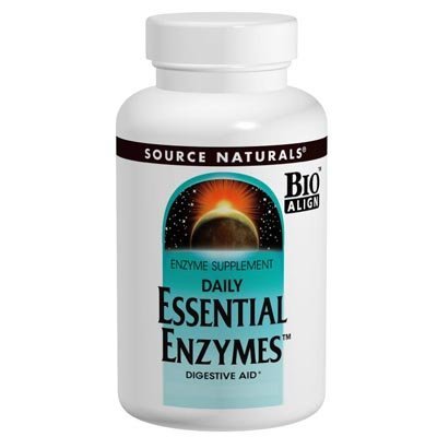 Source Naturals Daily Essential enzyme 500 mg 240 Capsules. As we age, hydrochloric acid and digestive enzyme secretion may both decline. Add to that the many additional factors-poor eating habits, inadequate chewing, "eating on the run," and over-consumption of alcohol-that put stress on the digestive process. Essential EnzymeTM is a Bio-Aligned Formula® that contains a wide array of enzymes that break down proteins, fats, milk sugar, fiber, and carbohydrates in a wide pH range. It aids the body's natural digestive process, helping to maximize the body's utilization of the nutrients in the diet while supporting digestive comfort.Feature