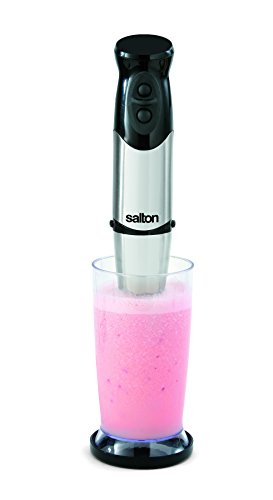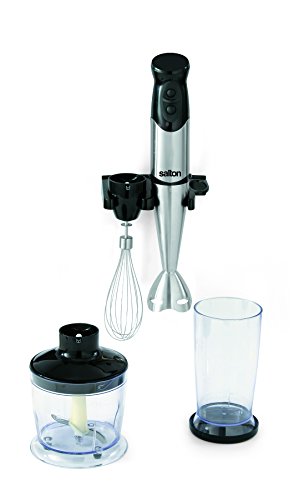 Studio : Salton Publisher : Salton Binding : Kitchen Product Description This hand blender is perfect for dips, sauces, soups, baby food, milkshakes and more! with a one-touch operation, just immerse the unit into your bowl/container and away you go! no need for extra cleanup. Set comes with the blender and whisk attachment, a 16oz / 500ml measuring cup, and a 16oz / 500ml chopper. 0