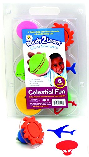 Your imagination can soar with this set of 6 durable and easily washable Ready2Learn™ Giant Stampers. Make pictures, decorate cards and wrapping paper, or just explore your artistic creativity! These stamps have large handles that are easy to hold for a young child, and they are great to use with our paint or ink pads. The set, in its own reusable, clear plastic storage case, includes a hot air balloon, sun, planet, plane, moon and kite.Feature