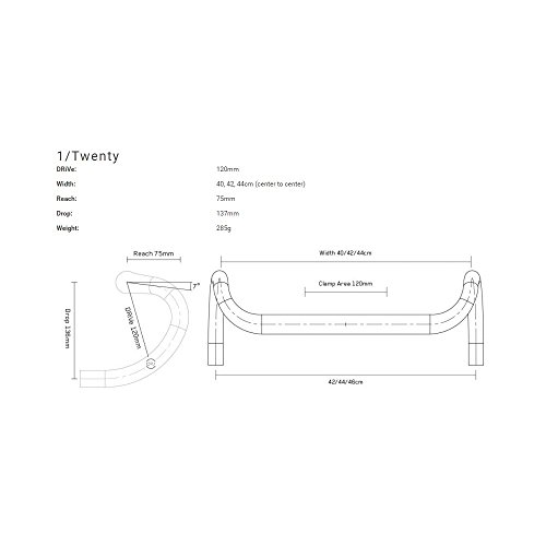 Studio : Profile Design Publisher : Profile Design Product Description If you prefer your bars with a slight upward rotation, then rest assured that you're not alone. Rotating the bars up can level the slope from flats to hoods, but it does often come at the expense of steep drops that aren't as stable as they would be if the bars were rotated forward. The short reach and generous drop of the 1/Twenty Road Handlebar address this by using Profile Design's Drop Reach Variable (Drive) Metric in order to keep the hood slope level, the bar ends parallel to the ground, and the sweet spot in the drops accessible, stable, and -- most importantly -- powerful. The 1/Twenty of the bar's title designates its Drive Variable of 120mm. This size entails a 75mm reach with a 137mm drop, dimensions that we're used to seeing either on heavily shaped ergo bars (the shallow reach) or huge, sweeping rounded bars (the generous drop). The 1/Twenty's Drive Metric is Profile's medium option, meant for riders with Goldilocks palms (not too big; not too small) to ensure that the forward position of the drops provides a secure platform during sprints that's ideally sized for the majority of cyclists. 0
