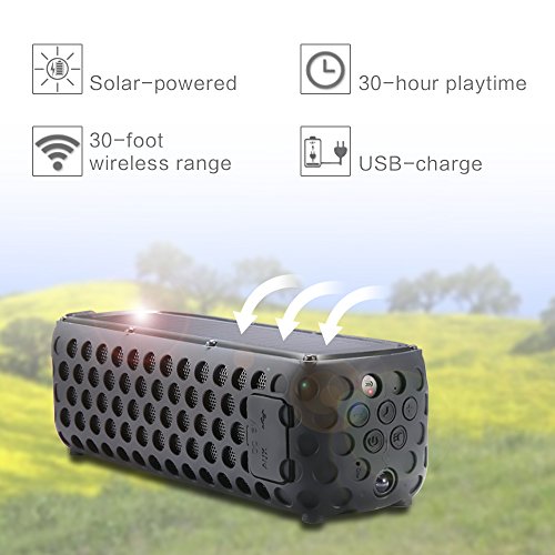 Bluetooth speaker with high-power solar panel, solar charge outdoors while play music; also built-in 2400mAh lithium-ion battery, 30 hours play time after a full charge.
