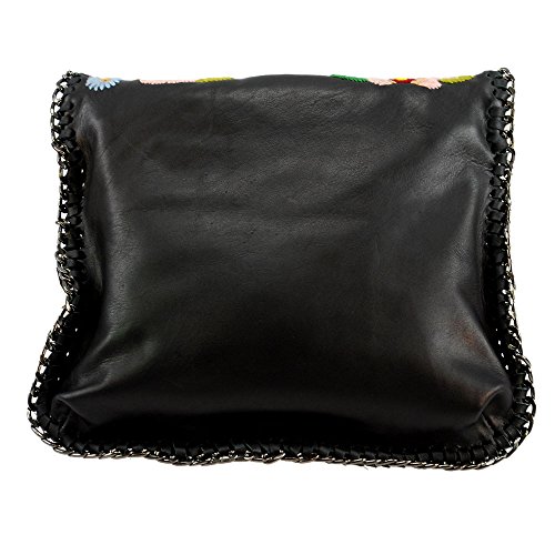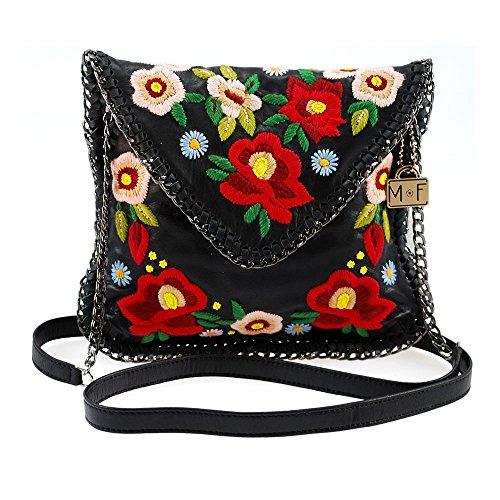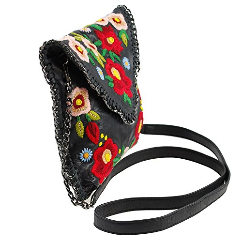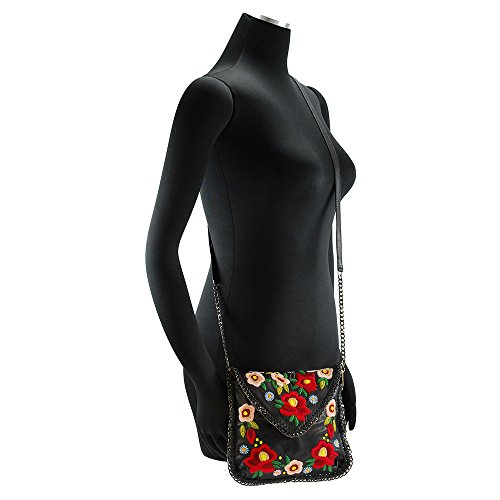 Modern Romantic. This black leather mini bag has vintage inspired embroidered flowers and chain trim that adds an edgy kick. Rock this look with your favorite jeans or a date pm dress!Dimensions: 7.75 x 0.75 X 7", Strap Length: 51, Strap Drop: 23, Features: Magnetic flap closure, removable cross-body chain strap, black microfiber lining, fits cell phone. Also available in Budding Prospect Crossbody Handbag.