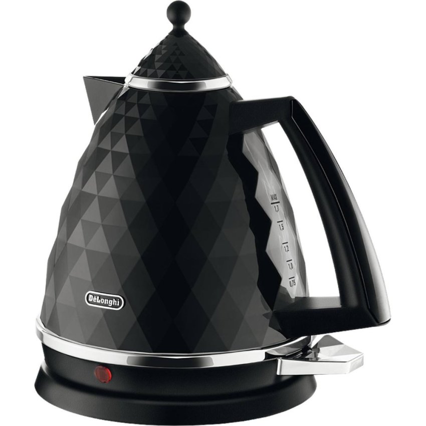 Water level indicator located on the back of the kettleSWIVEL BASE360° swivel base. Detachable base forcord-free convenienceANTI-SCALE FILTERRemovable and washable anti-scale filterDETAILSCAPACITY: 1,7 l.Exclusive plastic faceted finishing with chromed details360° swivel base. Detachable base for cord-free convenienceWater level indicatorFlat stainless steel concealed element3-level safety protection:1) Auto shut-off when water begins to boil2) Thermal Cut-off3) Auto shut-off when body is lifted from baseRemovable, washable anti-scale filterCord storageNon-slip feet