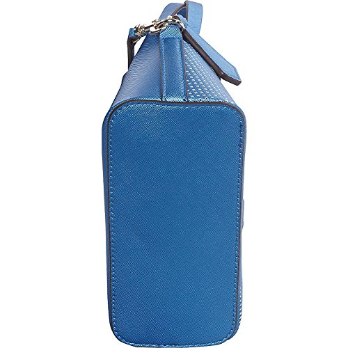 Saffiano-textured faux-leather exterior with perforated detail. Pale gold-tone hardware.
