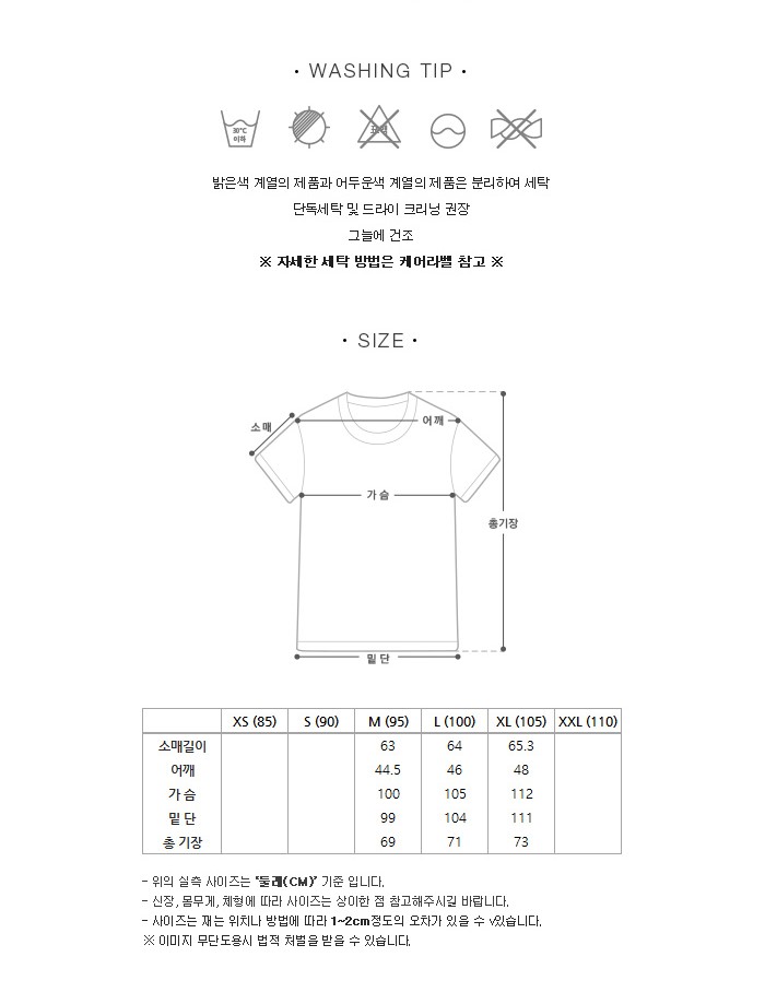 | 되도록 드라이 크리닝 하십시오. 손세탁시 뒤집어 단독세탁 하십시오. 착장시 가방류나 밝은 색상의 의류에 이염 될 수 있으니 주의 하십시오. 반드시 단독 손세탁 또는 드라이 하십시오. 세탁시 탈색의 우려가 있으므로 단독 세탁하십시오. 품질 경영 촉진법에 의한 품질 표시를 꼭 참조하시어 세탁하십시오. 합성세제 세탁시 손상 및 탈색의 우려가 있으므로 미지근한 물에 중성세제로 세탁하십시오. 절대 염소계 표백제로 표백할 수 없습니다. 땀에 젖었을 경우 즉시 세탁하십시오. 심하게 비비거나 비틀어 짜지 마십시오. 물에 10분이상 담가두지 마십시오. 취급부주의로 인한 탈색 및 오염 등 제품의 형태 변질 및 수축된 제품은 보상이 불가능 하오니 주의 하십시요. 취급표시대로 세탁하지 않을시에는 보상받으실수 없습니다. |