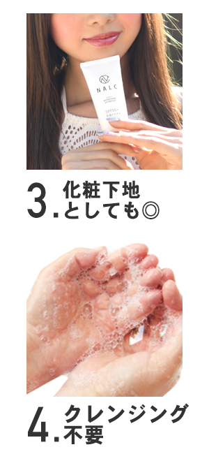 従来の日焼け止めですと、肌に白浮きが現れ見た目も悪くなりがちですが、NALCの日焼け止めは白浮きがなくいつもの雰囲気を保っていただけます。