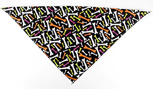 Studio : Groomer's Choice Publisher : Groomer's Choice Binding : Misc. Product Description This bandana has a 30" diagonal and is made of a 50/50 poly-cotton blend. Bones are scattered around the black background in multi-color neon. Made in the USA, this bandana is the perfect blend of a cute, funny, and spooky look for your furry friend to dress up in this Halloween season. 0