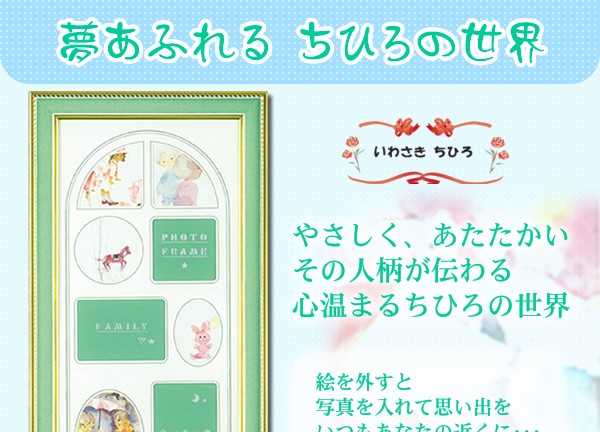 絵本画家として多くの人から愛され続けている「いわさき ちひろ」の作品。まるで童話の世界から飛び出して来たような、そんなどこか懐かしく心温まるイラストです。水彩画と水墨画を生かした独特の色彩も見ものです。商品サイズ:555×255×10mm 重量:665g 素材・材質:樹脂 ※サプライヤー直送品 ご注文後3~4営業日後の出荷となります【商品名】いわさきちひろ ファミリーフレーム(中)グリーン