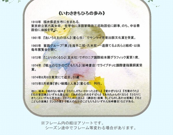 やさしく、あたたかいその人柄が伝わる心温まるちひろの作品。絵本画家として多くの人から愛され続けているその作品は、まるで童話の世界から飛び出してきたような、どこか懐かしく そして新鮮なイラストです。