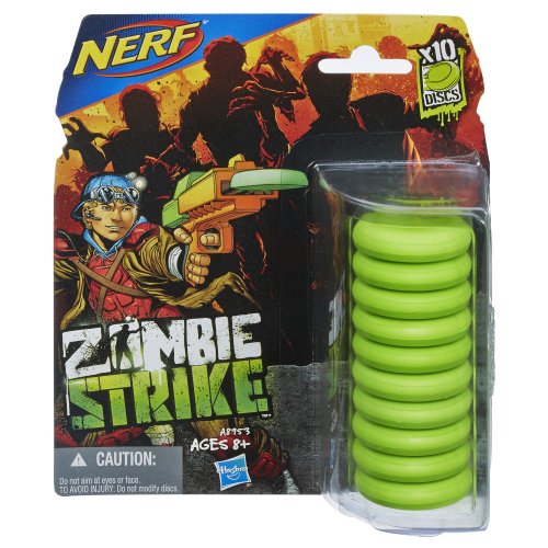 -. Binding : Toy -. Brand : Nerf -. EAN : 0692000187555 -. Feature : High quality toys for children all ages / Made using safe materials / Tested for quality and durability / Load up on discs with this Zombie Strike Refill pack / Includes 10 Zombie Strike discs for zombie blasting / Discs work with Ripshot, Ricochet and Fusefire blasters - sold separately / Includes 10 Zombie Strike discs -. IsAdultProduct : 0 -. ItemPartNumber : HSBA8953 -. Label : Hasbro -. LegalDisclaimer : CAUTION: Do not aim at eyes or face. TO AVOID INJURY. Do not modify discs. -. Manufacturer : Hasbro -. Model : A8953 -. MPN : Nerf 10-pk. Zombie Strike Discs by Hasbro -. PackageQuantity : 1 -. PartNumber : Nerf 10-pk. Zombie Strike Discs by Hasbro -. ProductGroup : Toy -. ProductTypeName : TOYS_AND_GAMES -. Publisher : Hasbro -. Studio : Hasbro -. Title : Nerf Zombie Discs (10-Pack) -. UPC : 659213145260 -. Warranty : No Warranty