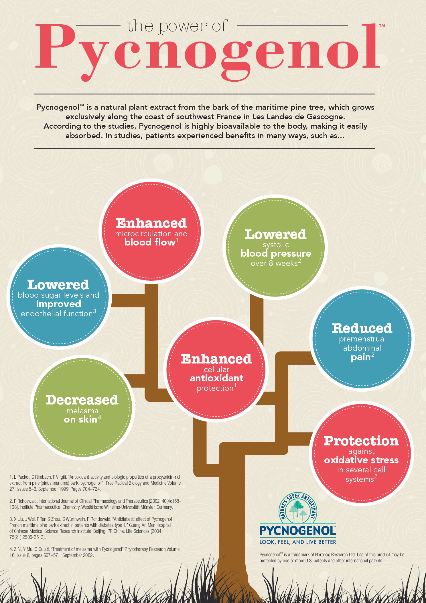 Pycnogenol is the trademark of Horphag Research (UK) Ltd. for a standardized extract of bark of the French maritime pine tree. Pycnogenol is particularly renowned for its extensive clinical research with more than 120 studies published in peer-reviewed medical journals. The flavonoids in Pycnogenol not only act as powerful antioxidants, they also appear to promote the normal generation of nitric oxide (NO). NO plays a key role in regulating cardiovascular health. Nitric oxide promotes the normal relaxation of arteries, supports normal diameter of blood vessels and helps maintain healthy blood pressure and circulation. NO promotes normal platelet activity allowing the blood to maintain a normal, fluid viscosity. Pycnogenol has been awarded various patents for its ability to support healthy platelet activity.*