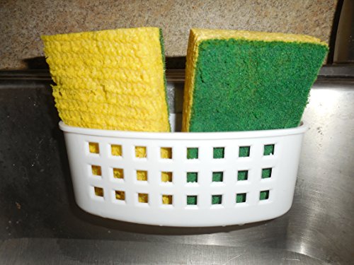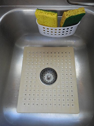 - Feature : TWO PIECE COMBINATION Bundle Includes a White Suction Cupped Sponge Caddy PLUS a Beige Protective Rubber Sink Mat / SPONGE CADDY (plastic) Holder for Two Standard Sized Sponges Or a Sponge and a Scouring Pad for Easy Accessibility. Allows for Draining Right Into the Sink. Suction Cups Firmly Adhere to Any Smooth Surface of the Sink. / PROTECTIVE RUBBER SINK MAT Prevents Chipping of China, Dishes, Cups and Saucers. Saves Wear and Tear on Sink Surfaces. Fits Almost All Sinks. Large Center Hole for the Drain with Cut Mark for Larger Opening. / A PRACTICAL GIFT for the First Time Apartment Dwellers or Home Owners. / Sink Mat - 12" x 10". Sponge Caddy - 6.5" wide x 2.25" deep x 2.5" high.