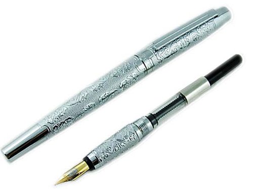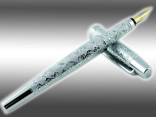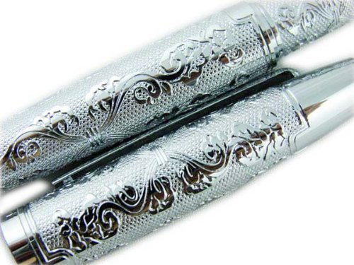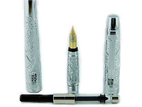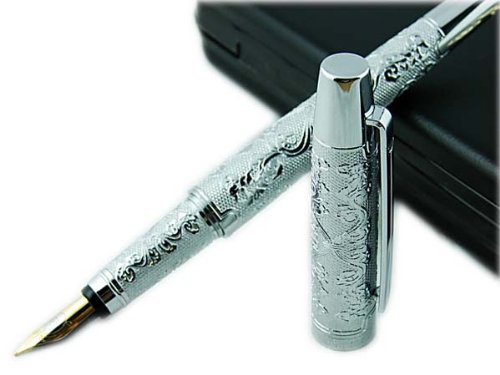 Lanxivi Hero Silver Flower Embossment Fountain Pen Iridium Medium Poit Pen Pouch Gift Box Set