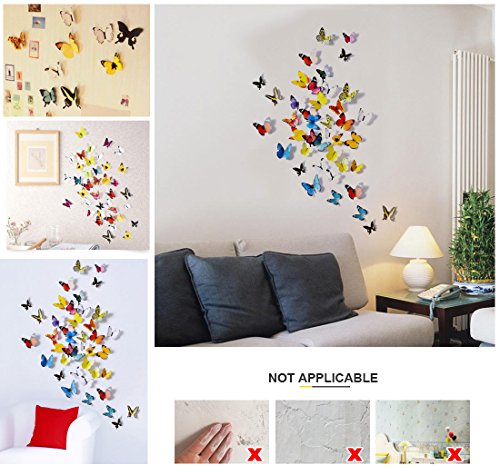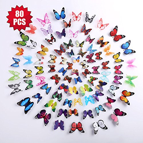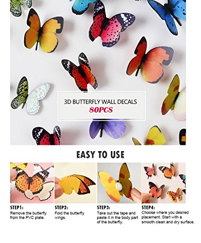 -. Feature : Vivid butterfly wall stickers set: 80 pieces artificial butterfly stickers with different sizes and colors (purple, pink, blue, yellow, green), DIY different shape you like to enjoy different moods. / Good decoration gadgets: Become an interior decorator and transform your living space to extraordinary one with these unique stickers. / Durable and Reusable: butterfly wall decals - can last a long time, Easy to clean and use again. / Versatile: Apply to decor a theme party, Wall Decals, Butterfly museum embellishment, Children room, Photography background, Christmas, Wedding, Birthday, etc. / Easy to stick: Can be used on any dry, Clean and smooth surface.The butterfly wall decors will not damage paint when removed.