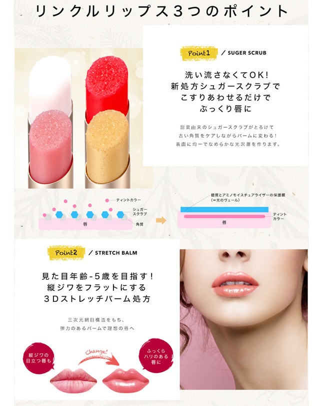 | 商品説明 | ◎3Dストレッチバーム 唇表面をつるんとなめらかに整えて弾力のある唇に。 ◎とろけるシュガースクラブ配合 角質をやさしくケアしながらすこやかな唇に。 ◎美容液成分でリッチなうるおい レチノール・エラスチン・フラーレン配合 ◎唇の水分量で発色するティントカラー 顔色を明るく見せる透明感ピンクで血色唇に。 ※メイク効果による *ほのかなオレンジアロマの香り <アルコールフリー/パラベンフリー> |