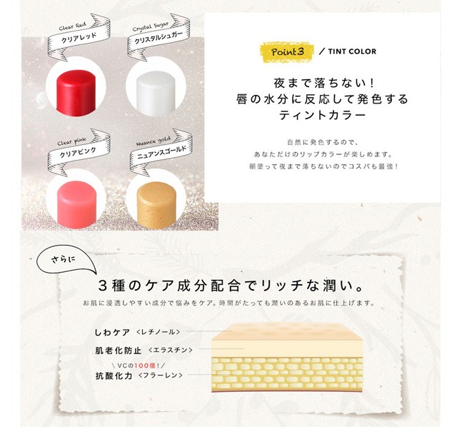 | 成分 | クリアピンク:水添ポリイソブテン、トリエチルヘキサノイン、ヒドロキシアルキル(C16-18)ヒドロキシダイマージリノレイルエーテル、ヒドロキシステアリン酸エチルヘキシル、スクロース、リンゴ酸ジイソステアリル、ポリエチレン、水添ポリデセン、マイクロクリスタリンワックス、キャンデリラロウ、シリカ、レチノール、加水分解エラスチン、フラーレン、オレンジ果皮油、トコフェロール、ラウロイルグルタミン酸ジ( フィトステリル/オクチルドデシル)、(ビニルジメチコン/メチコンシルセスキオキサン)クロスポリマー、メントキシプロパンジオール、バニリルブチル、クエン酸、クエン酸Na、炭酸Ca、BG、水、トリ(カプリル酸/カプリン酸)グリセリル、アスコルビン酸Na、PVP、PEG- 40 水添ヒマシ油、赤223、赤202、黄5 ニュアンスゴールド:水添ポリイソブテン、トリエチルヘキサノイン、リンゴ酸ジイソステアリル、ヒドロキシアルキル(C16-18)ヒドロキシダイマージリノレイルエーテル、ヒドロキシステアリン酸エチルヘキシル、ポリエチレン、水添ポリデセン、スクロース、マイクロクリスタリンワックス、キャンデリラロウ、シリカ、レチノール、加水分解エラスチン、フラーレン、オレンジ果皮油、トコフェロール、ラウロイルグルタミン酸ジ( フィトステリル/オクチルドデシル)、(ビニルジメチコン/メチコンシルセスキオキサン)クロスポリマー、メントキシプロパンジオール、バニリルブチル、炭酸Ca、BG、水、トリ(カプリル酸/カプリン酸)グリセリル、アスコルビン酸Na、PVP、PEG- 40 水添ヒマシ油、マイカ、酸化チタン、酸化鉄、ホウケイ酸( Ca /Al) 、赤223 クリアレッド:水添ポリイソブテン、トリエチルヘキサノイン、リンゴ酸ジイソステアリル、ヒドロキシアルキル(C16-18)ヒドロキシダイマージリノレイルエーテル、ヒドロキシステアリン酸エチルへキシル、ポリエチレン、水添ポリデセン、スクロース、マイクロクリスタリンワックス、キャンデリラロウ、シリカ、レチノール、加水分解エラスチン、フラーレン、オレンジ果皮油、トコフェロール、ラウロイルグルタミン酸ジ(フィトステリル/オクチルドデシル)、(ビニルジメチコン/メチコンシルセスキオキサン)クロスポリマー、メントキシプロパンジオール、バニリルブチル、クエン酸、クエン酸Na、BG、水、トリ(カプリル酸/カプリン酸)グリセリル、アスコルビン酸Na、PVP、PEG-40水添ヒマシ油、硫酸Ca、酸化チタン、ラウロイルリシン、水酸化Al、赤202、黄4、赤223、黄5、赤104(1)、青1 クリスタルシュガー:水添ポリイソブテン、トリエチルヘキサノイン、リンゴ酸ジイソステアリル、ヒドロキシアルキル(C16-18)ヒドロキシダイマージリノレイルエーテル、ヒドロキシステアリン酸エチルへキシル、ポリエチレン、水添ポリデセン、スクロース、マイクロクリスタリンワックス、キャンデリラロウ、シリカ、レチノール、加水分解エラスチン、フラーレン、オレンジ果皮油、トコフェロール、ラウロイルグルタミン酸ジ(フィトステリル/オクチルドデシル)、(ビニルジメチコン/メチコンシルセスキオキサン)クロスポリマー、メントキシプロパンジオール、バニリルブチル、クエン酸、クエン酸Na、BG、水、トリ(カプリル酸/カプリン酸)グリセリル、アスコルビン酸Na、PVP、PEG-40水添ヒマシ油、ホウケイ酸(Ca/Al)、酸化チタン、赤223 |