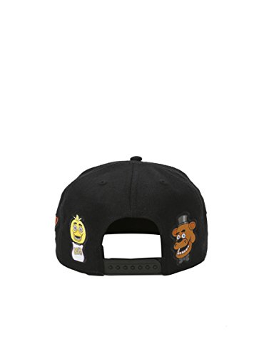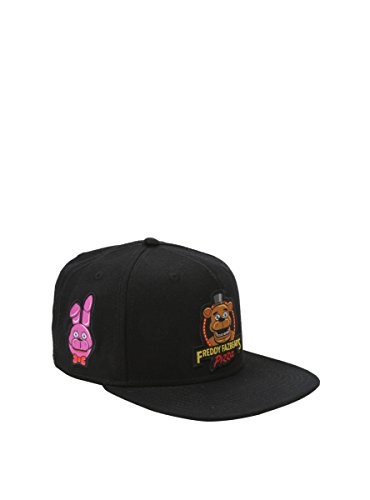 Product Description Black snapback hat from Five Nights at Freddy's featuring a Freddy Fazbear's Pizza logo design on front with character patches on the side and back panels. 0
