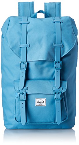 HERSCHEL LITTLE AMERICA MID VOLUME SHALLOW SEA RUBBER Der Herschel Rucksack Little America Mid-Volume, in der Farbe hellblau, bietet ein Hauptfach mit Überschlagklappe, inklusive einem 13" Laptopfach, dass zusätzlich mit weichem Plüsch gefüttert ist. Die Überschlagklappe wird mit den, von den Riemen verdeckten, Magnetdruckknöpfen verschlossen. Das Hauptfach ist mit einem schönen gestreiften Stoff, in der Farbe rot/weiss, ausgestattet und kann zusätzlich mit einer Kordel zu gezogen werden. In dem Hauptfach befindet sich seitlich noch ein kleines Fach, für einem mp3 Player, mit Kopfhörerausgang. Auf der Vorderseite befindet sich eine aufgesetzte Tasche, mit Reißverschluss und den darüber liegenden Riemen mit verdeckten Magnetdruckknöpfen. Das Rückenpolster ist dank seiner 3 Teiligen Polsterung sehr bequem, die gepolsterten und verstellbaren Rückenriemen sind optimal für Ihren Rücken. Das Herschel Logo ist klein und dezent auf der Vorderseite angebracht. Die Maße des Herschel Rucksacks sind 38cm in der Höhe, 28cm in der Breite und 13cm in der Tiefe (Volumen: 14, 5 Liter). Der Little America Rucksack ist hochwertig verarbeitet, besteht außen aus 100% gewebten Polyester und das Innenfutter besteht aus 100% Polyester.Feature