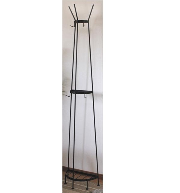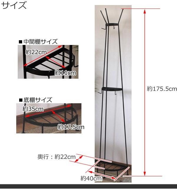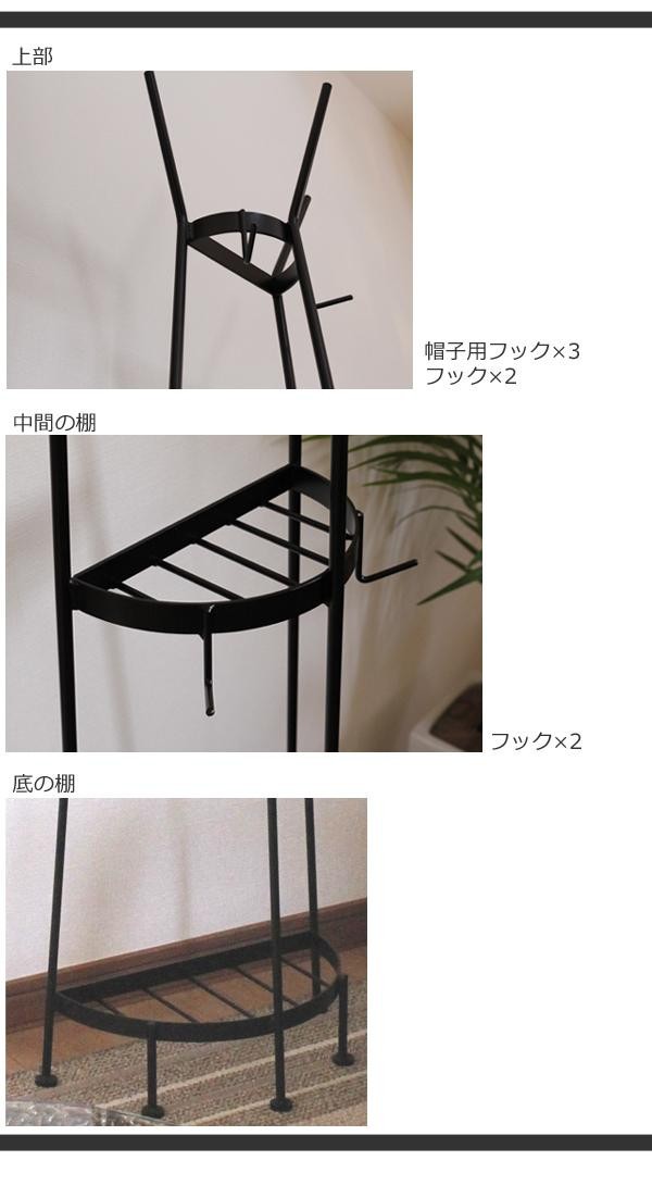 | 服やバッグ、帽子が掛けられるハンガーラックです。半円形なので壁につけて置くことができ、主張しすぎない黒色のアイアン製でどんなインテリアにもなじみます。中間と底の棚にはグリーンやフォトなどを飾ったり♪「自由の女神」のイメージさせるデザインです。 |