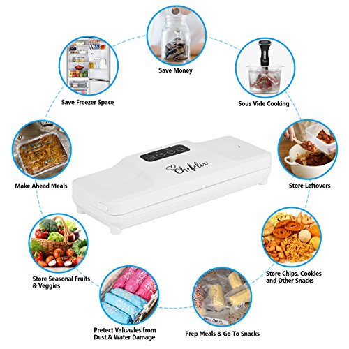 Keep Food Fresh Up To 8 Times Longer: Preserve the freshness and flavor of all your foods for up to 5 - 8 times longer than conventional storage methods. Suctions all the air out of the food storage pouch, and seals the opening shut, to prevent freezer burns on frozen fruits and vegetables, and keeping ingredients entirely free from nasty bugs and bacteria.