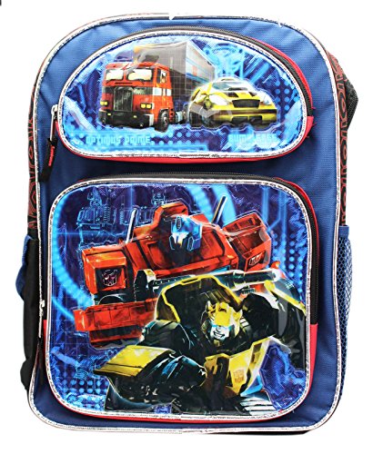 -. Feature : Transformers backpack / Full size backpack / Features both mesh and velcro close side pouches / Three compartments in descending size / Measures 16in (40.5cm) tall and 12in (30.5cm) wide