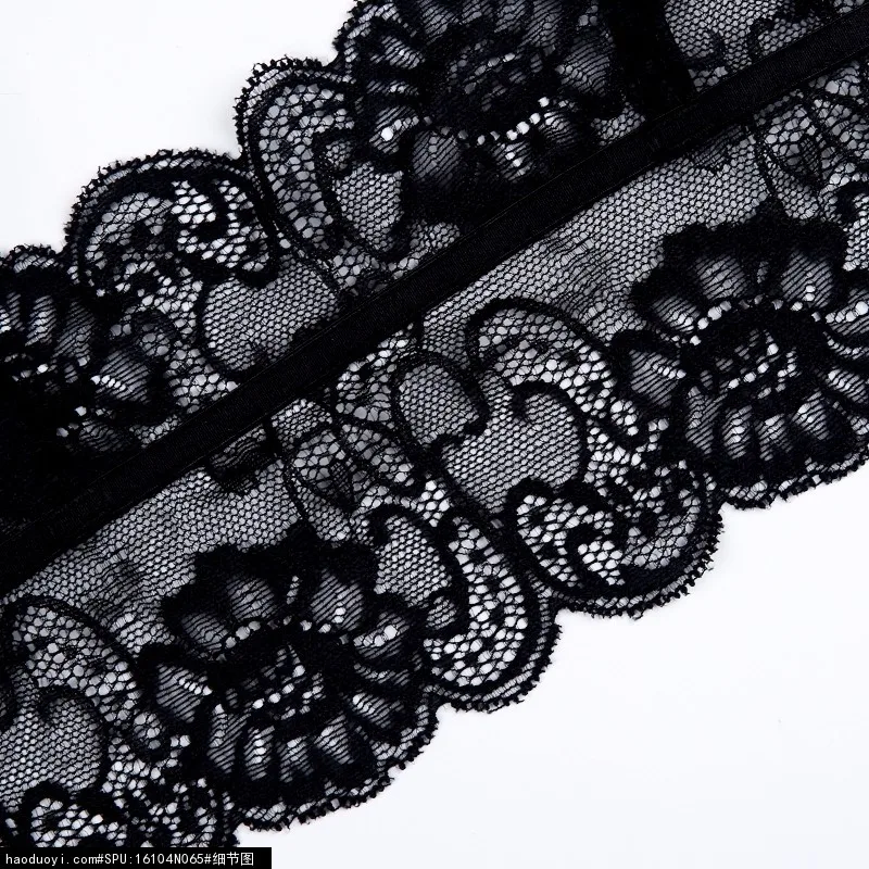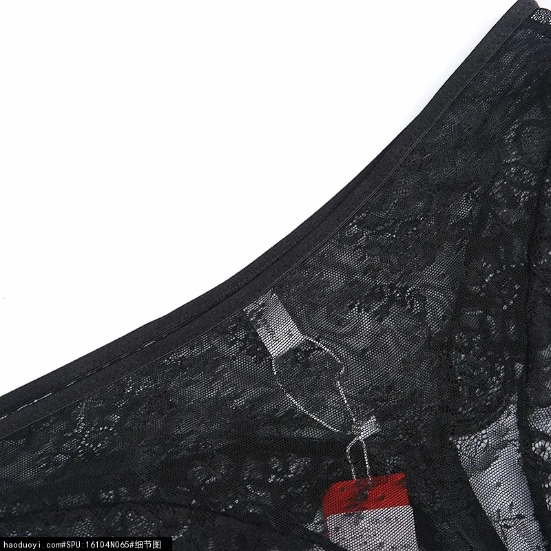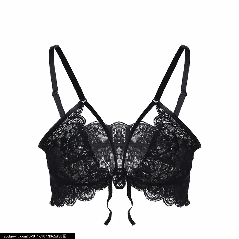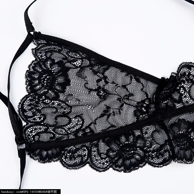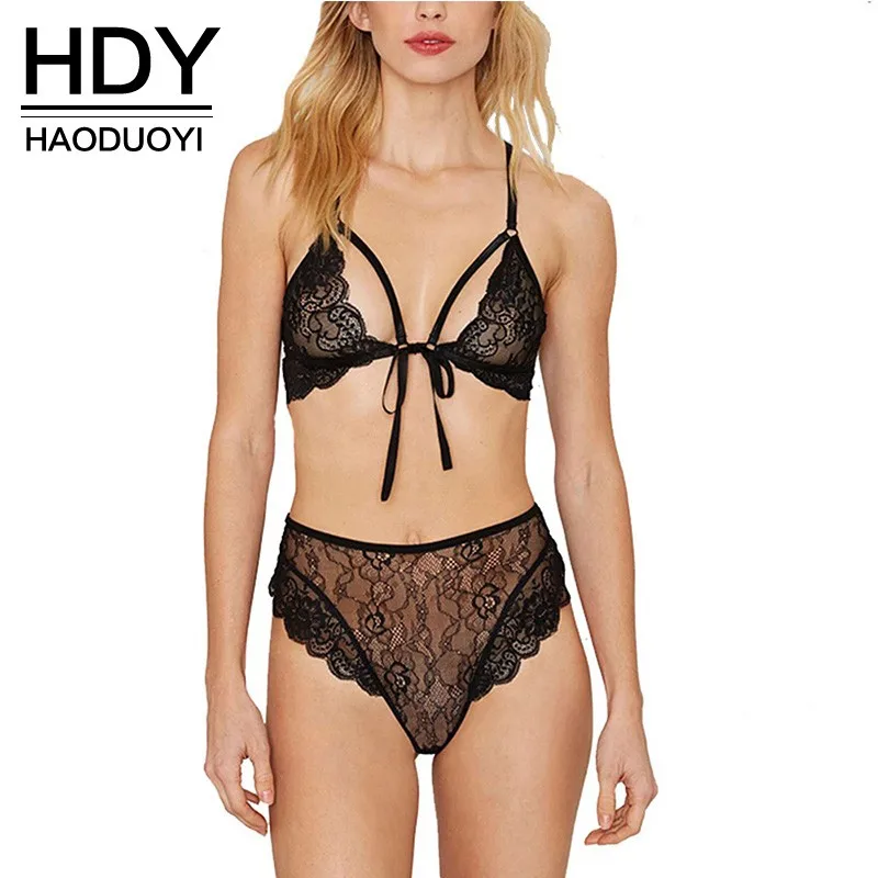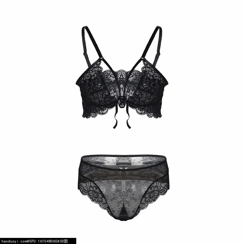 | HDY Haoduoyi Wave Hem Lace Bralette Sexy Push Up Bra Set Solid Black Bra Convertible Straps Pull Up Bra Sexy Hollow Out Panties |